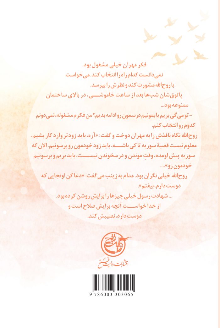 روح الله نگاه نافذش را به مهران دوخت و گفت: آره باید زودتر وارد کار بشیم. معلوم نیست قضیه سوریه تا کی باشه باید زود خودمون رو برسونیم. الان که سوریه پیش اومده وقت موندن و درسخوندن نیست باید بریم و برسونیم خودمون رو..